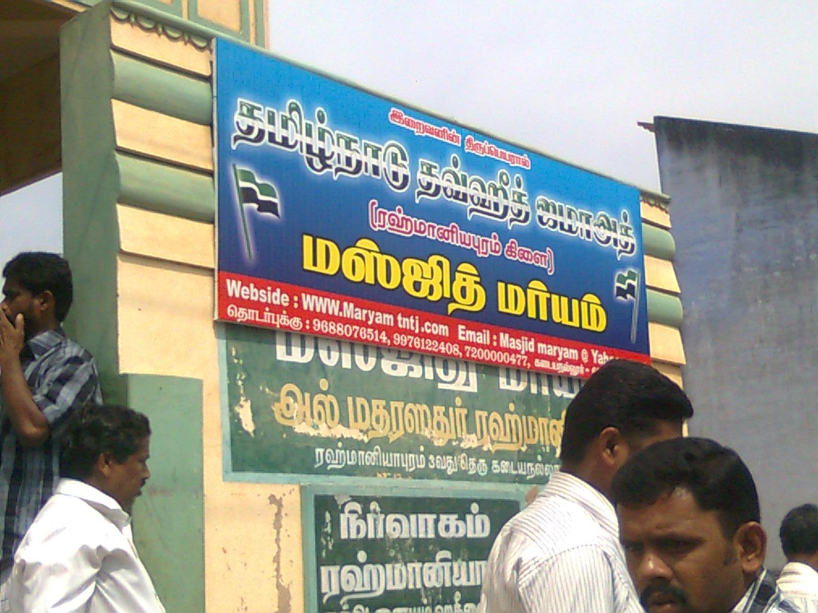 முன்னர் மஸ்ஜிது மர்யம் அல் மதரஸதுர் ரஹ்மான், நிர்வாகம், ரஹ்மானியபுரம் பகுதி குர் ஆன் ஹதீஸை பின்பற்றும் மக்களுக்கு மட்டும் சொந்தமானது (பார்க்க படம்) என்று சுவரில் எழுதப்பட்டிருந்தது. பள்ளிவாசலுக்கு பெயிண்ட் அடிக்கும் போர்வையில் இதை அழித்துவிட்டு TNTJ ரஹ்மானியாபுரம் கிளை ( பார்க்க படம்) என்ற போர்டை பள்ளிக்கு வெளியே தொங்கவிட்டனர். இதை கண்டு அதிர்ந்து போன JAQH அமைப்பினர் தங்களது தலைமைக்கு தகவல் தெரிவித்தனர். அவர்களின் தலைமையின் வழிகாட்டுதலின் பெயரில் கடையநல்லூர் JAQH னர் கடையநல்லூர் காவல் நிலையத்தில் 20.11.2011 அன்று புகார் செய்தனர். அந்த புகாரின் பெயரில் காவல் துறையினர் கடையநல்லூர் ரஹ்மானியாபுரம் TNPJ யினரை அழைத்து அன்று மஃரிப் தொழுகைக்கு பின் உடனடியாக பள்ளிக்கு உள்ளேயும் வெளியேயும் முன்னர் எப்படி இருந்ததோ அப்படியே இருக்க வேண்டும். இதில் ஏதாவது மாற்றம் செய்தால் உங்கள் (TNPJ )மீது கிரிமினல் நடவடிக்கை எடுக்க வேண்டியது வரும் என்று ரஹ்மானியாபுரம் TNPJ யின் மோசடி, களவாணிச் செயளாலர் புஹாரி மற்றும் உள்ளவர்களிடம் எழுதி வாங்கியுள்ளனர்.